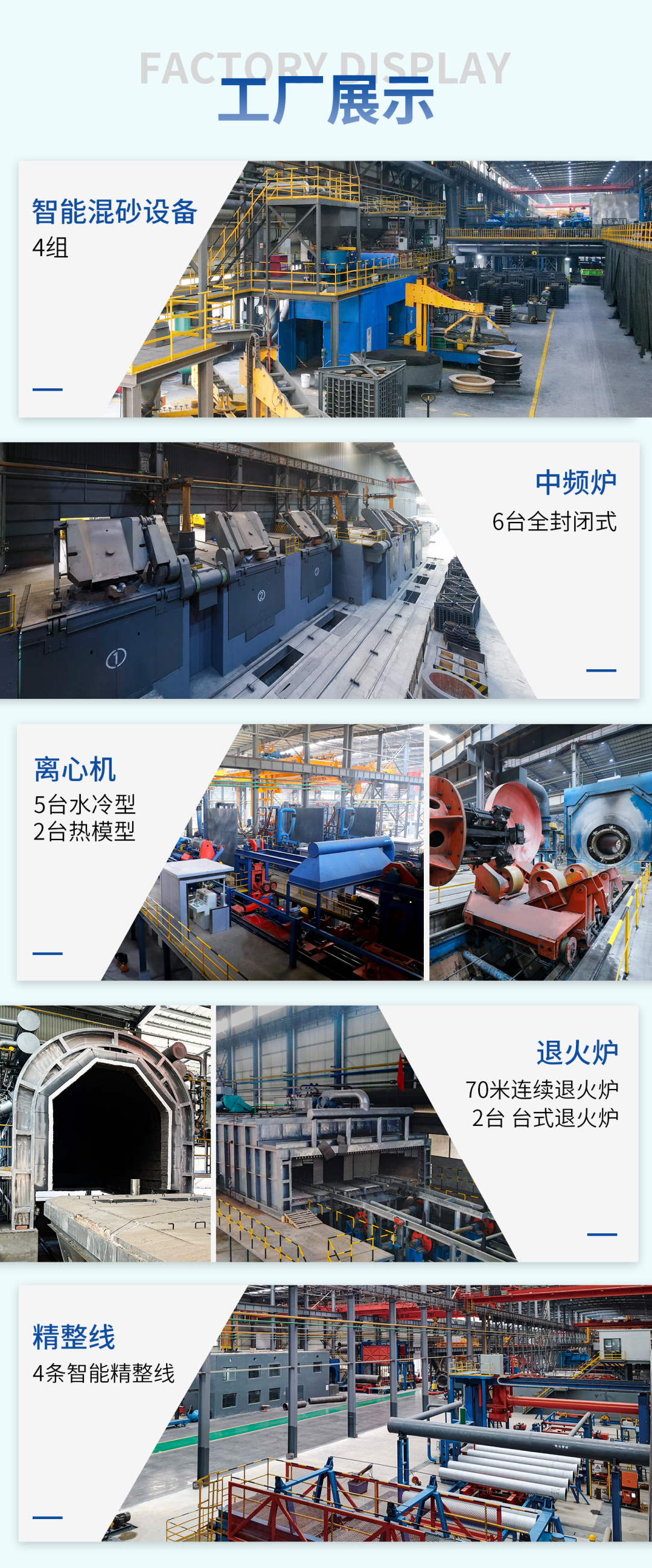 The casting workshop currently has 6 sets of 10t/h fully enclosed medium frequency furnaces, 4 sets of fully automatic sand mixing core making machines, 5 water-cooled centrifugal casting machines, 2 hot mold centrifugal casting machines, 1 70 meter long continuous annealing furnace, 2 thermal storage trolley horizontal annealing furnaces, and 4 intelligent finishing lines.